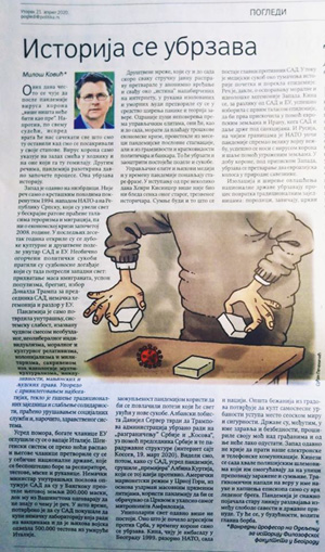 Управљачке елите и њихови медији и у времену пандемије понављају старе фразе. У иступању од пре неколико дана Хенри Кисинџер више није био ни бледа сенка оног старог, трезвеног историчара. Сумње буди и то што се заокупљеност пандемијом користи да би се повлачили потези који ће свет увући у нове сукобе. Албански лобиста Данијел Сервер тврди да Трампова администрација убрзано ради на „разграничењу“ Србије и „Косова“, уз помоћ председника Србије и те парадржавне структуре (интернет сајт Коссев, 19.3.2020). Видели смо, потом, како су САД, усред пандемије, срушиле „премијера“ Аљбина Куртија, који се тој идеји противио. Амерички марионетски режим у Црној Гори, из основа уздрман масовним црквеним литијама, користи пандемију да би се обрачунао са Црквом и ухапсио самог митрополита Амфилохија.