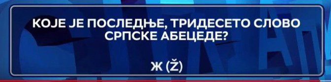 Прошле године је на питање, који је једини језик на свету који има два писма, одговор био – српски, иако то нема никаквог утемељења у међународној класификацији језика и писама. Прошле недеље на питање, која је најбројнија национална мањина у Србији, одговор био – Мађари, иако су Албанци бројнији. Наравно, за онога ко поштује српски Устав. Већ у епизоди пре неко вече наставља се антинационални низ, који се сад већ не може подвести под грешку. Питање је: Које је последње слово „српске абецеде“? И одговoр је Ж(Ž).