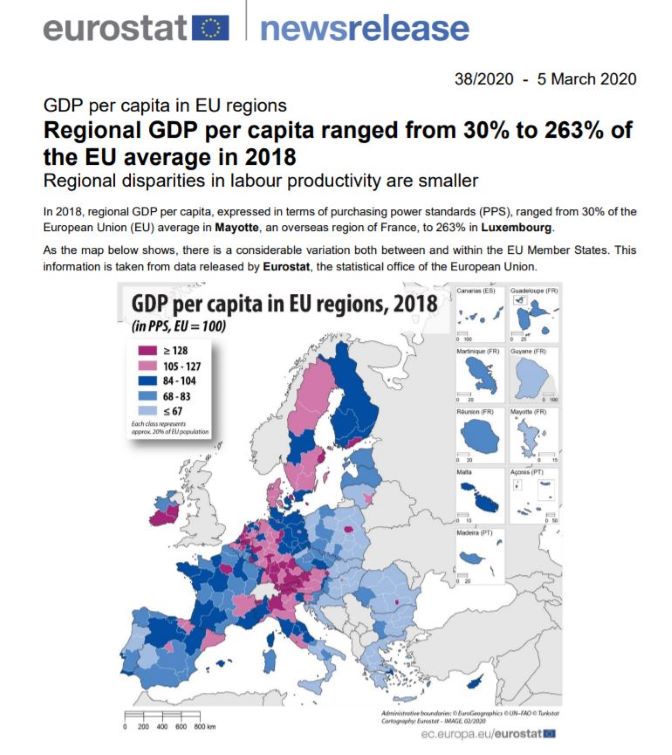 Евростат је објавио саопштење под насловом „Регионални БДП по становнику је био у распону од 30% до 263% просека ЕУ у 2018“. Саопштење коментарише податке на двоцифреном нивоу регионалне класификације НУТС.