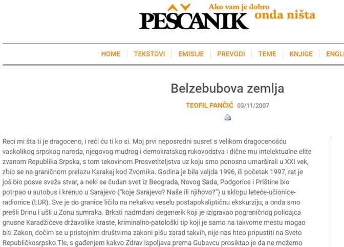Теофил Панчић Српску назива „гнусном Караџићевом државоликом крастом”, „гломазном цркотином, разјапљеном насред пута”, „’Розмарином бебом’, прекомандованом из пакла међу живе људе”, „нељудским Неместом”, „перверзном творевином без историјског, географског, демографског или било којег другог сувислог утемељења”. Српска, по Панчићу, „нема ’бољу страну’: то је настало путем зла и зарад зла, и у вечном одржавању пламена зла и мржње исцрпљује се његов смисао, и ту помоћи нема”.