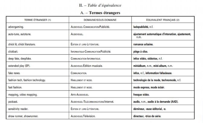 Део табеле страних речи из француског Службеног гласника (Извор: legifrance.gouv.fr)