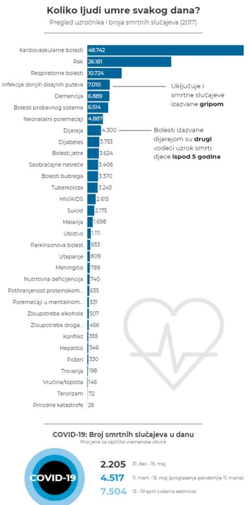 Смртни случајеви изазвани вирусом ковид-19 су у вестима свакодневно, али колика је смртност од ове болести у поређењу са осталима