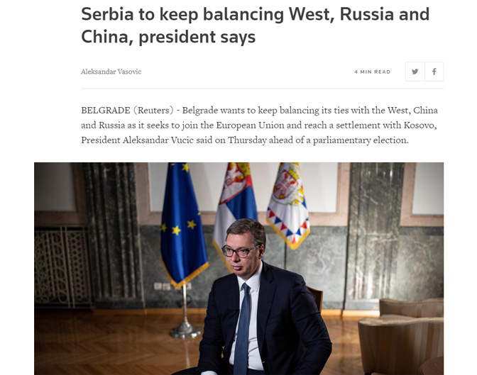 Ројтерс указује да Србија зависи за енергију од Русије са којом сарађује и војно, и да је председник Владимир Путин два пута посетио Београд од када је Вучић дошао на власт 2012. а да руски министар спољних послова Сергеј Лавров треба да посети Србију идуће недеље.