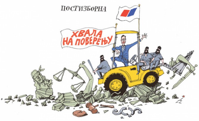 Слободан Јовановић је писао да су политичке странке друштва за експлоатацију државе. Српска напредна странка је организација која је спремна не само да очерупа државу него и да је уништи. Ради се о клијентелистичкој изборној машинерији чији једини циљ је да се освајањем и вршењем власти њени кадрови обогате. Иако је вероватно нетачно да број њених чланова достиже чак 700.000 извесно је да међу њима нема ниједног јединог који има било каква политичка уверења. Ради се о чистим ловцима на положаје лишеним било каквих обзира према народу и држави. Уколико та машинерија не буде заустављена Србија ће нестати.