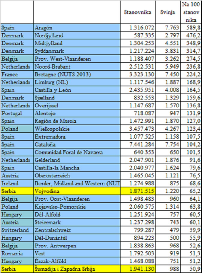 Србија је, подаци су за 2017, и даље велики и интензивни узгајивач свиња, макар Војводина и Шумадија и Западна Србија, мерено односом броја свиња према броју становника.