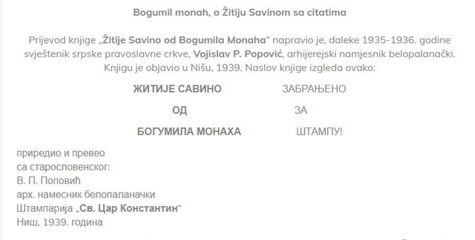„Поред неколико одавно познатих житија Св. Саве Немањића, мањих и већих, у прошлој деценији је публиковано сасвим непознато и дуго скривано »Житије Савино од Богумила Монаха«, апокрифно-богумилски спис настајао крајем XII и почетком XIII века а можда и нешто касније, његов препис. Српски превод са старословенског случајно је 1986. пронашао познати новинар НИН-а Драган Јовановић, приредио га за штампу и објавио у Београду 1995. године.