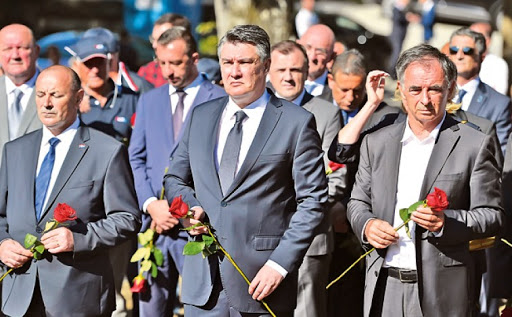 Комеморација српским жртвама: министар бранитеља Томо Медвед, председник Хрватске Зоран Милановић и председник Савета СНВ-а Милорад Пуповац (Фото Бета/Хина/М. Стрмотић)