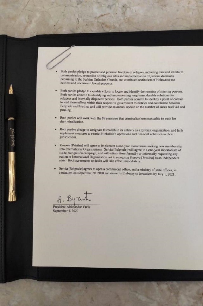 Вучић је у интервјуу за РТС рекао да је Србија тражила да то пише у споразуму, са изузетком Израела, и додао да Приштина не може да добије признање ниједне земље.