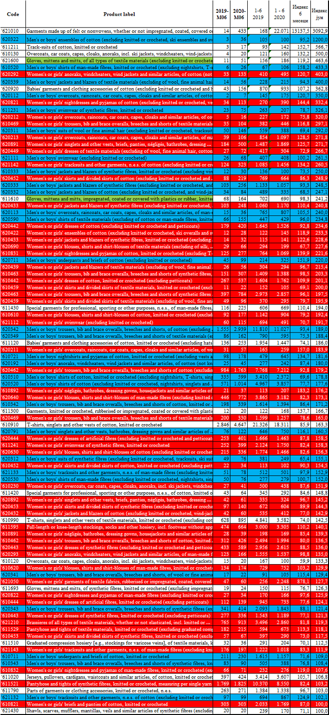 Укупно је увоз одеће повећан за 2%, за шест месеци, са 164,7 на 168,1 милиона евра, и овде је разврстано 100 од 219 група производа четвороцифрене царинске класификације од којих је 98 имало раст увоза у јуну.