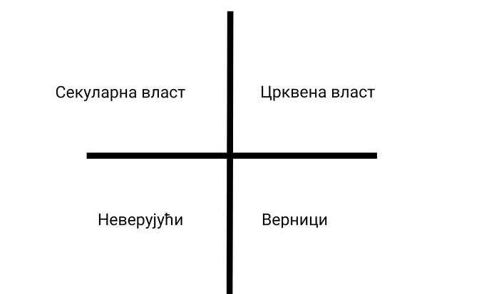 Вертикално, друштво је подељено у 1. државу коју води секуларна влада, 2. цркву која има своју владу, то јест Свети архијерејски сабор и Свети синод. Ова два сегмента јасно су одвојена један од другог. Хоризонтално, друштво је подељено у оне који владају и оне којима се влада. У трећем пољу налазе се неверујући који се подвргавају само секуларној власти. Четврто поље представља вернике, то јест свештенство, монаштво и паству. Но овај последњи сегмент мора се подврћи не само црквеној влади већ и секуларној власти. Тако је одувек било. Данас, међутим, сваки од ова четири сегмента подељен је на још два дела, а они ни у ком случају нису једнаки. Један део, предвођен не само секуларном влашћу већ и црквеном, много је већи, гласнији и моћнији од другог, који ми се чини тако мали да је готово невидљив. Већина је жучно решена да „иде у Европу“, док ми, у другом делу, питамо: „Како? Па зар ми нисмо у Европи?“ Кад бисмо упитали људе на улици због чега су тако жељни да се придруже Европи, шта очекују да тамо нађу, стекли бисмо утисак да је њихова једина жеља да добију визу и могу да путују. Виза је за Србе постала ново златно теле. Ако бисте их потом упитали шта желе да учине у тој новој обећаној земљи у коју ће та толико жуђена виза да их одведе а која се зове Европска унија, не бисте добили јасан одговор. Не због тога што се људи плаше да кажу шта им заиста лежи на срцу. Не, људи у Србији се више ничега не плаше – и то је застрашујуће. Тај феномен заслужује да се о њему каже више јер је одсуство страха заправо један од највећих и најстрашнијих проблема с којима се Србија данас суочава. Не бисте добили јасан одговор јер га нема. Људи не знају зашто би путовали. Свеједно им је куда иду, свеједно им је шта ће чинити када тамо буду приспели. Мени се чини да они желе да путују да више не би били сами, да се не би осећали усамљеним, одбаченим и напуштеним од свих. Србима је мука од усамљености. Али оно што је трагично је што они изгледа не схватају је да ће, када буду постали део Европске уније, и даље бити усамљени и одбачени као данас јер је Европска унија клуб за одабране, клуб тако ексклузиван да чак ни чланство у њему не гарантује прихватање за равноправног члана. Пољска, Бугарска и Румунија, па чак и Грчка, већ то добро знају. Али Срби су изгледа глуви за њихове огорчене притужбе против „обећане земље“. Српски народ посматра с апсолутном равнодушношћу море доказа да се према Бугарима и Румунима Европа понаша као зла маћеха из бајки а не мајка какву су очекивали. Али, ни народи, као ни обични људи, не уче се на туђим грешкама.