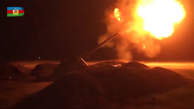 Дејство азербејџанске артиљерије, вероватно самохотке 2С7 Пион (Фото: Министарство одбране Азербејџана/Твитер)
