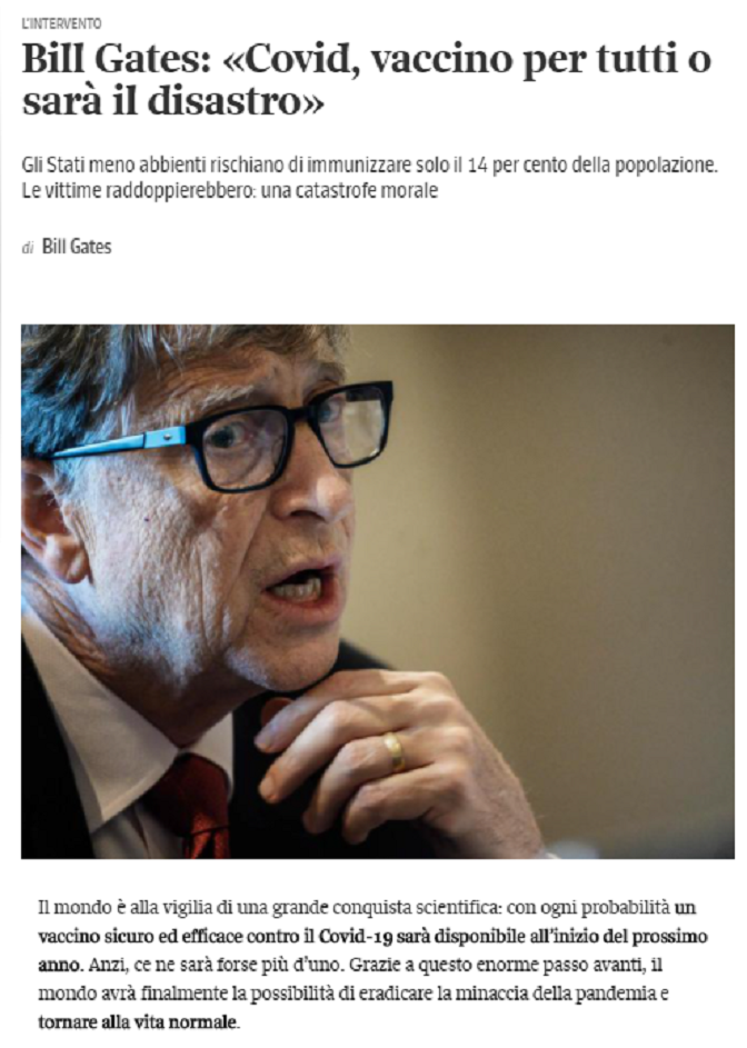 „Научници су разматрали шта ће се десити ако дистрибуција вакцина не буде равноправна и дошли до два сценарија. У првом, вакцина је дистрибуирана државама на основу њиховог броја становника. Други сценарио је сличан ономе што се тренутно догађа, а то је да ће педесет најбогатијих држава прве добити две милијарде доза. Према другом сценарију, вирус ће неконтролисано да се шири још четири месеца после тога на три четвртине планете. Због тога ће број жртава бити двоструко већи“, наводи Гејтс и додаје да би то била морална катастрофа.