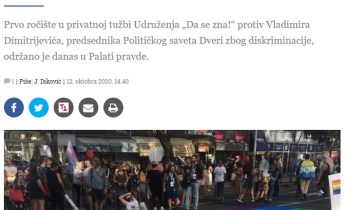 Испред удружења „Да се зна!“, које прати и документује случајеве противправног поступања над ЛГБТ+ особама и говор мржње, сведочила Драгослава Барзут Прво рочиште у приватној тужби Удружења „Да се зна!“ против Владимира Димитријевића, председника Политичког савета Двери због дискриминације, одржано … Настави са читањем НВО „Да се зна!“: В. Димитријевић помно прати наш рад и извргава га руглу