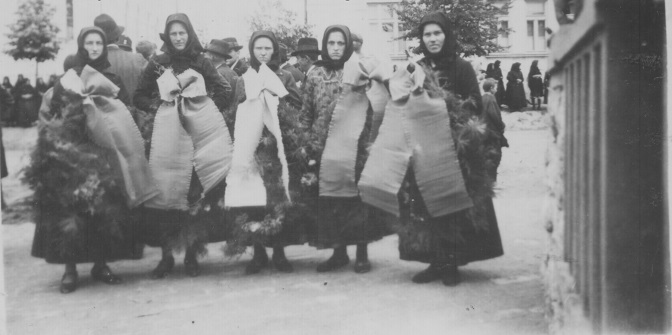 Чалманке носе венце испред Цркве у Чалми према гробљу за петорицу немачких војника који су погинули током 1944.