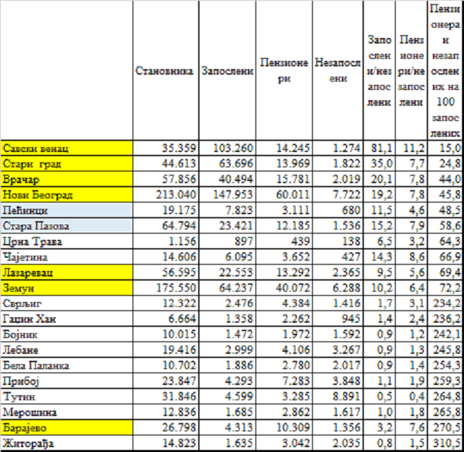 Већи број запослених лица од броја пензионера и незапослених имале су 34 општине у Србији међу којима је било 12 у Београду и 22 ван њега