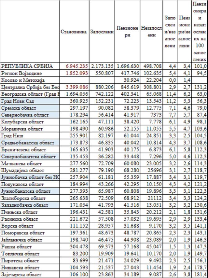 Све остале области у Србији имају већи збирни број пензионера и незапослених у односу на број запослених лица.