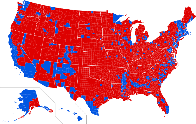 Резултати америчких председничких избора 2016. по окрузима (Карта: Викимедија)