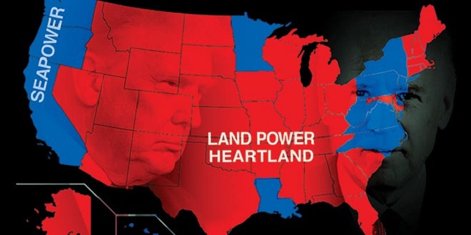 И ту почиње оно најзанимљивије. Ако погледамо политичку мапу САД и офарбамо је бојама две главне политичке партије по принципу који гувернери и које партије доминирају сваком од њих, добијамо три траке. Источна обала биће плава, ту су концентрисане велике градске зоне и у складу с тим доминирају демократе. Централни део САД – индустријске и пољопривредне зоне – јесте Хартленд и готово је читав црвен. То је зона утицаја републиканаца. На Западној обали се опет налазе мегалополиси, центри високих технологија и опет је ту плава, боја демократа.