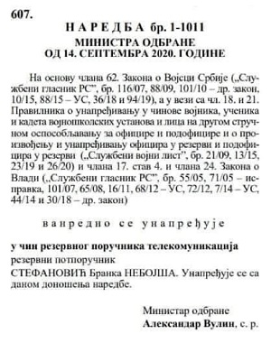 У Службеном војном листу објављена је наредба којом Вулин ванредно унапређује Небојшу Стефановића у чин резервног поручника телекомуникација