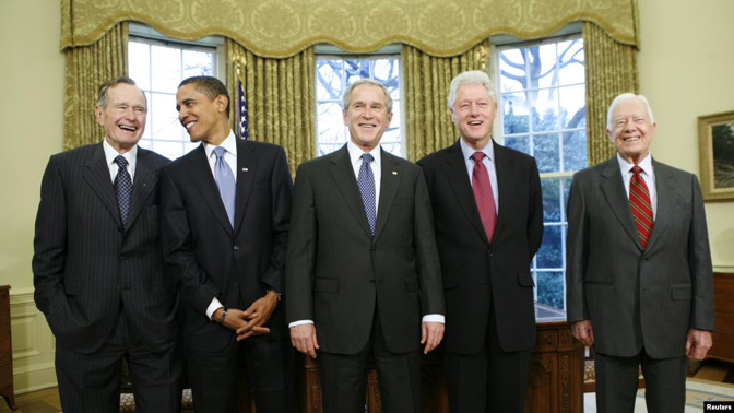 Џорџ Буш Старији, Барак Обама, Џорџ Буш Млађи, Бил Клинтон и Џими Картер у Овалној канцеларији Беле куће 7. јануара 2009. (Фото: Ројтерс)