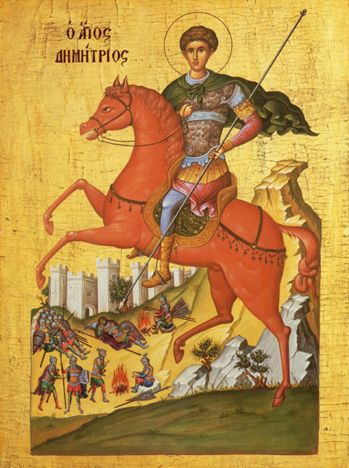 5. Ако покушамо да некога тако великог похвалимо само оним спољашњим, рећи ћемо да је место где је рођен на неки начин глава целе Тесалије и да је своје име символично добило према сили коју је касније пројавило и делима. Томе ћемо додати и блиставост његових предака и славу родитеља. Међутим, иако је све то достојно дивљења, то би било бескорисно дело, јер нису они њему, него је он њима велика похвала. Како је Димитрије могао да се украси свим тим стварима кад је он сам украсио читаву васељену, а поред ње и вишњи свет? Шта је било његов украс? Непоколебива вера, безгранична благодат, божанствено и неотуђиво богатство богоугодних врлина које су сада похрањене у небеску ризницу, будући да је и сам постао допуна тамошњим ризницама највећих добара. Боље речено, он је са земље прешао на небо, и за живота и сада када је узет од земље, будући највећи додатак вечним красотама, јер је Димитрије васељенска и истовремено надсветовна красота.