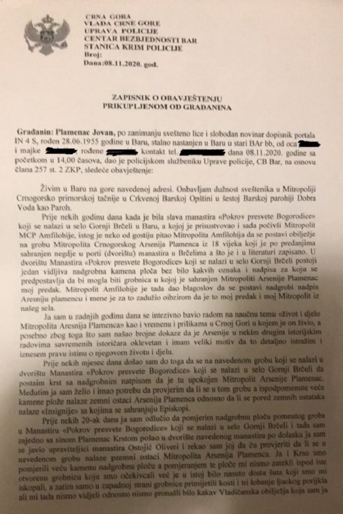 Наиме, испред манастира у Брчелима постоји гроб без натписа за који се претпоставља да припада Митрополиту Арсенију Пламенцу, па је покојни Митрополит Амфилохије прошле године дао налог да се стави крст са обиљежјем на гроб и за то задужио свештеника Јована Пламенца. Да би био сигуран да је то митрополитов гроб, отац Јован је са сином Крстом подигао плочу да би фотографисао земне остатке са инсигнијама, да има доказ да је то Митрополит Арсеније и да би поставио крст. Међутим, испод плоче се нашла прљавштина, шут и кости од 3 човјека, без назнака да је неки од њих био владика. Шут је очистио како гробница не би била више скрнављена прљавштином, а остало је не пипнувши заштитио и конзервирао како би се уз помоћ археолога утврдило коме припада гроб јер се испоставило да није све како је очекивао.