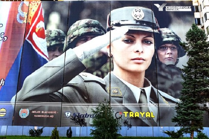 Прошао сам поред огромног постера са српским војницима, са строгом женом која салутира, с оптужбом у очима. Он је прекривао бивше jугословенско министарство одбране, које је НАТО бомбардовао 1999-те, а његови унакажени остаци тако остављени.