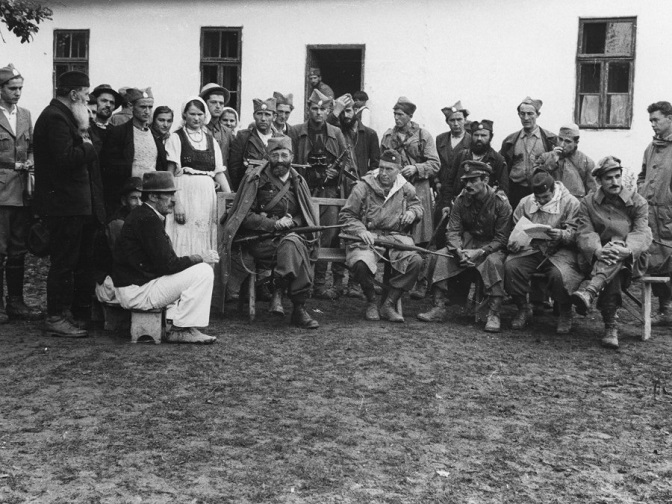 Семберија, ране јесени 1944 Седе генерал Михаиловић, пуковник Макдауел и капетани Милодраговић, Рајачић и Лалић. Стоји у средини поручник Рајо Бањичић (Фото: http://kingdom-of-yugoslavia-in-ww2.com/)