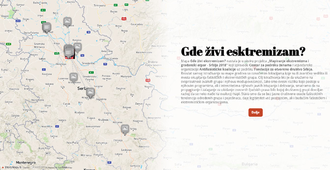 „Центар за подршку женама“ је организација која је одговорна за пројекат „Мапирање екстремизма и грађански отпор – Србија 2018“ у коме је заједно са још гомилом других, идеолошки проблематичних група, а уз подршку „Фондације за отворено друштво Србија“ наводно започела истраживање о актуелним облицима екстремизма у Србији. У оквиру наведеног пројекта настала је интерактивна мапа са насловима: „Где живи екстремизам“ и „Где спава фашиста“. На мапи се налазе градови у Србији са означеним локацијама, која су наводно седишта или места окупљања фашистичких и екстремистичких група и организација (овде). Овај пројекат су здружено промовисали медији: „Дојче веле“(овде), Б92(Србија је натопљена фашизмом), Маглочистач (овде), Аутономија инфо („Србија је четничка држава“), Зрењанин данас (овде).