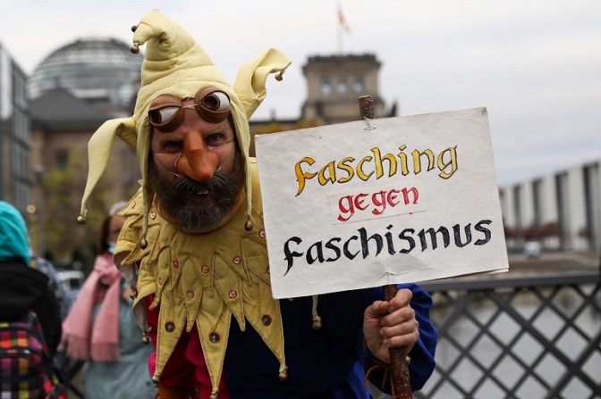 Протестант са натписом ‘Карневал против фашизма’, 18. 11. 2020. (Фото: Кристијан Манг/Ројтерс)