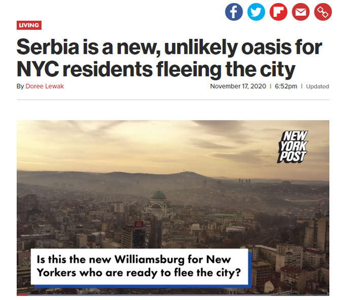 Србија је постала неочекивана оаза за Њујорчане гладне путовања током пандемије корона вируса, пише Њујорк пост, преносећи искуства неколико младих становника “Велике јабуке” који су претходних месеци посетили Београд.