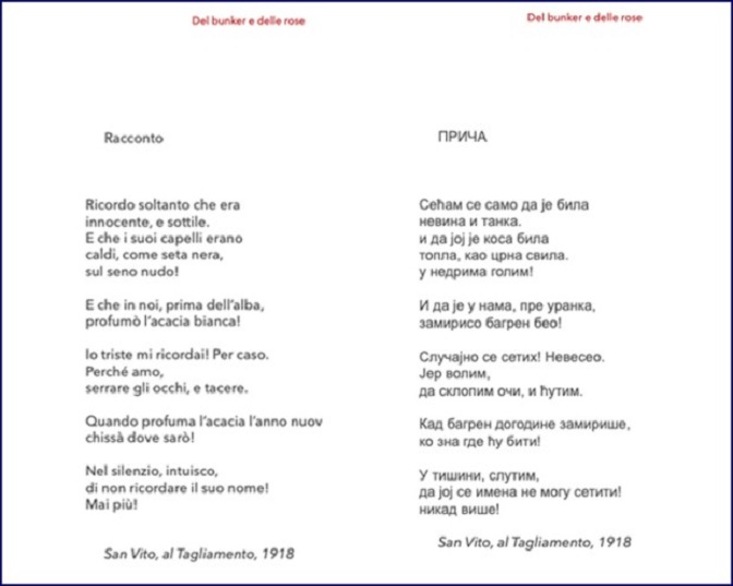 Андријана је превела на италијански и песму „Прича“ и делове књиге „Лирика Итаке и коментари“. Глумац Горан Шушљик прочитао је песму „Прича“ на српском, док је на италијанском та улога додељена глумцу Луиђију Миору. Њихове гласове прати одломак Сонате у бе-молу, П110 за виолину и клавир Оторина Респигија из 1917. године.