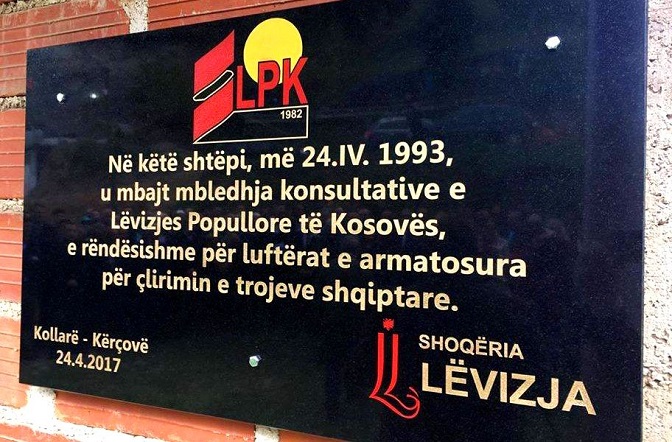 Спомен плоча у Кичеву, Македонија, постављена на месту где је одржан састанак руководства „Народног покрета Косова“, 24. априла 1993. године. На овом састанку је покрет преименован у „Народни покрет за Републику Косово“ и одлучено да се за њу мора борити свим методама, укључујући оружје. У тој борби је требало сарађивати са свима, али не и са колебљивцима, што је била јасна алузија на Руговин ДСК. У закључцима са састанка је наведено да се рука мора пружити и Албанцима из Црне Горе и Македоније, који су неправедно отргнути од матице, и пате под „Србо-Црногорско-Македонским окупаторима“. На састанку су учествовали Хашим Тачи, Азем Суља и друге касније вође ОВК. (Фото: Изгубљени рај)