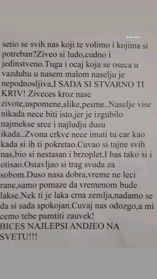 Ако ни због чега другог зато што је био опште омиљен и у основној и средњој школи, у насељу у којем је живео и шире и што му је на сахрану по леденом дану на Батајничко гробље изашло више стотина потресених људи, ојађених трагичном судбином успешног, храброг, борбеног, племенитог детета, које никоме није одбило помоћ, а сам је није добио ни од кога.