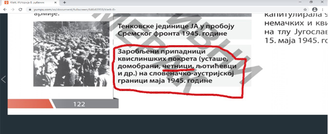 На стр. 122 приказана је слика „заробљених припадника квислиншких покрета (усташе, домобрани, четници, љотићевци и други) на словеначко – аустријској граници маја 1945. године.“