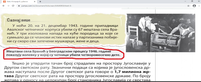 Све иде уз слику где „мештани села Вранић у Београдском процесу 1946. год. показују колевку у којој су четници убили четворомесечно дете.“