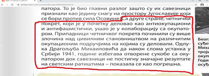 „Са друге стране, четнички покрет, који је у почетку деловао као антиокупациони и антифашистички, ушао је у колаборацију са окупатором. Припадници четничког покрета починили су више злочина над цивилним становништвом на различитим окупационим подручјима на којима су деловали. Одлука Драгољуба Михаиловића да након слома устанка у Србији 1941. године. избегава отворене сукобе са окупатором док савезници не постигну заједничке резултате на светским ратиштима – показала се као погрешна.“ (стр.123)