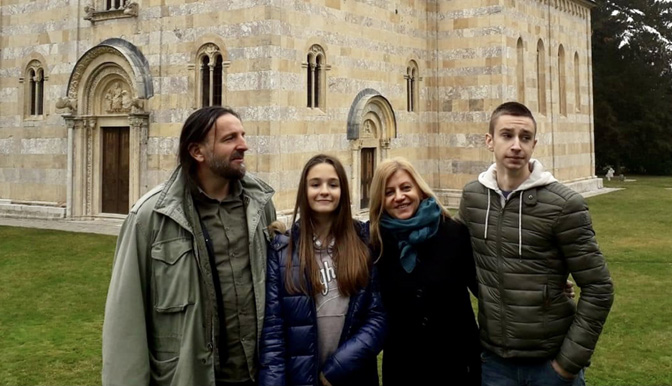 Соња и Живојин Ракочевић са децом у манастиру Високи Дечани (Извор: Твитер о. Саве Јањића)