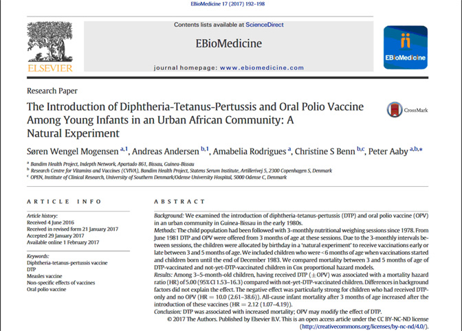 Истраживање под називом „Природни експеримент: примјена ДТП и ОПВ вакцине код дјеце нижег узраста у градској заједници у Африци“ („The Introduction of Diphtheria – Tetanus – Pertussis and Oral Polio Vaccine Among Young Infants in an Urban African Community: A Natural Experiment”), по налогу Владе Данске и задужбине Ново Нордиск, уз учешће водећих свјетских стручњака за вакцинацију у Африци и под вођством два најпознатија доктора, Сeрена Могенсена и Петера Абија, бавило се проучавањем посљедица вакцинације ДТП и ОПВ вакцинама у једној градској заједници у афричкој држави Гвинеја Бисао.