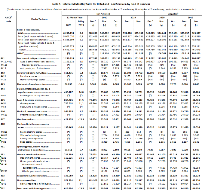 У децембру 2020. промет у малопродаји у САД је смањен за 0,7%, у односу на новембар 2020, док је повећан за 2,9% у односу на децембар 2019, у десезонираној серији података (овде).