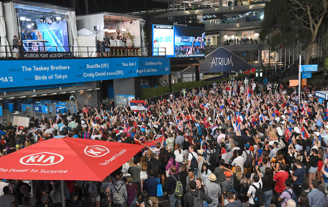 Са хиљадама навијача у Мелбурну Ђоковић (на балкону у плавој тренерци) дели успех и радост прошлог јануара (Извор: Између сна и јаве)