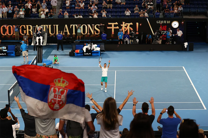 Новак Ђоковић узвраћа навијачима после победе над Арсланом Карацевом у полуфиналу Аустралијан опена 2021. (Фото: Гети)