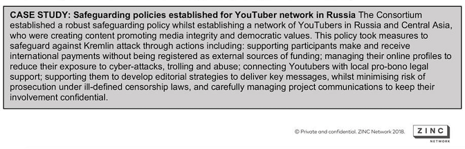 У документу под ознаком „приватно и повјерљиво“, Цинк је открио улогу Конзорцијума у успостављању „мреже јутјубера“ у Русији и Средњој Азији са сврхом пропаганде Уједињеног Краљевства и његових савезника из НАТО-а.