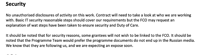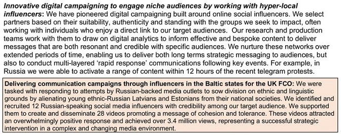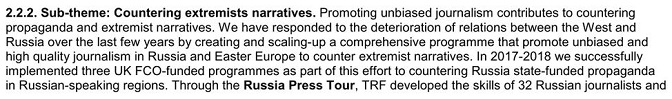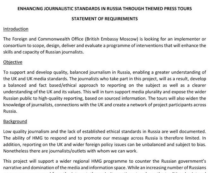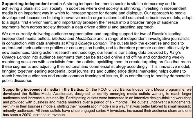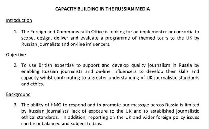 Ројтерс и Би-Би-Си наметљиво су тражили вишемилионске уговоре у сврху подстицања британских државних интервенционистичких циљева, обећавајући да ће култивисати руске новинаре на течајевима и обиласцима Енглеске које би финансирао МСП, успоставити мреже утицаја у Русији и око Русије, и рекламирати натовску причу у областима у којима се говори руски језик.