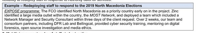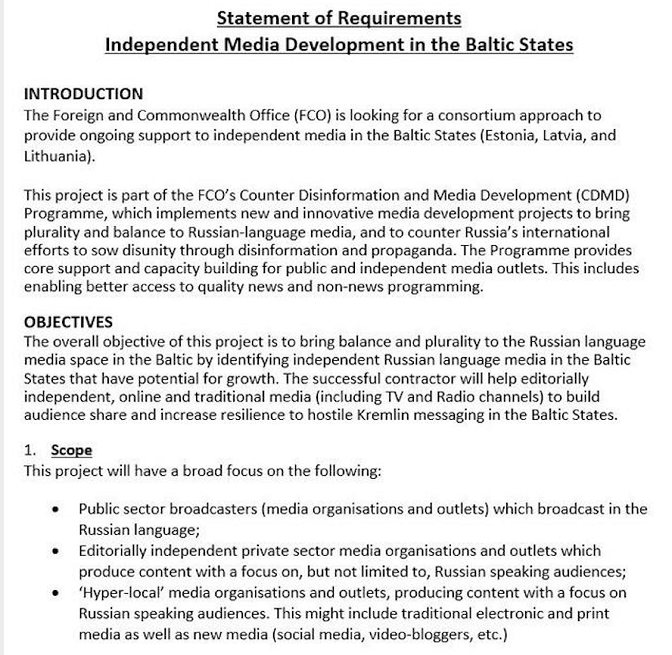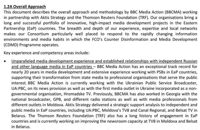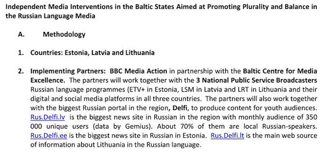 Како се види на доњем документу, Би-Би-Си је очито успјешно конкурисао за учешће у тајном програму на Балтику посредством своје непрофитне фирме Медијска акција Би-Би-Си-ја (BBC Media Action).