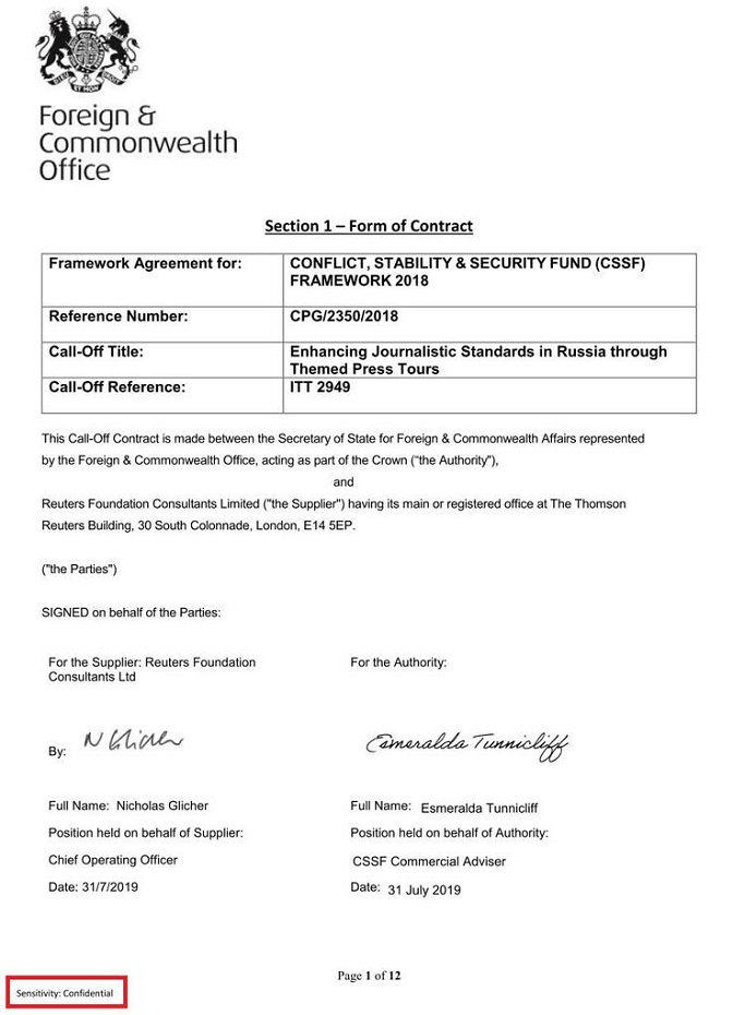 На крају приче, изгледа да је Ројтерсова пријава прошла, пошто је јула 2019. Ројтерс склопио уговор с Фондом за конфликте, стабилност и безбједност енглеског МСП-а (Conflict, Stability & Security Fund, CSSF). Али изгледа да ни једна ни друга страна нису хтјеле да јавност зна за њихову сарадњу на пројекту супротстављања Русији. Уговор је носио ознаку „повјерљиво“.