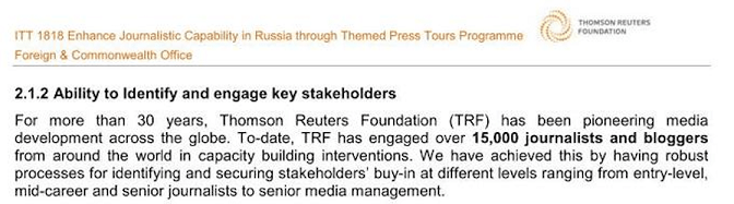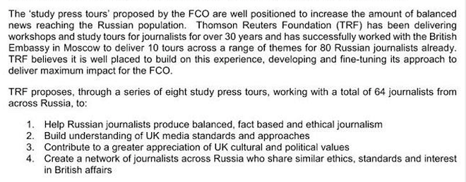 Ројтерс је тврдио да је по налогу Британске амбасаде у Москви већ организовао десет посјета Енглеској у сврху обуке за укупно осамдесет руских новинара, предложивши додатних осам, обећавајући „промоцију културних и политичких вриједности Уједињеног Краљевства“ и „стварање мреже новинара широм Русије“ којима ће спона бити „корист за Британију“.
