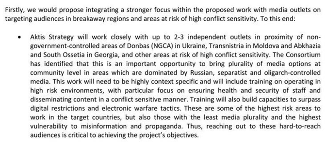 Би-Би-Си је понудио да учествује и у посебним медијским пропагандним програмима МСП-а у Украјини, Молдавији и Грузији. Као кључне савезнике у конзорцијуму навео је Ројтерс и сада угашену обавјештајну агенцију Актис стратеџи (Aktis Strategy), која је учествовала у претходним програмима британског МСП-а.