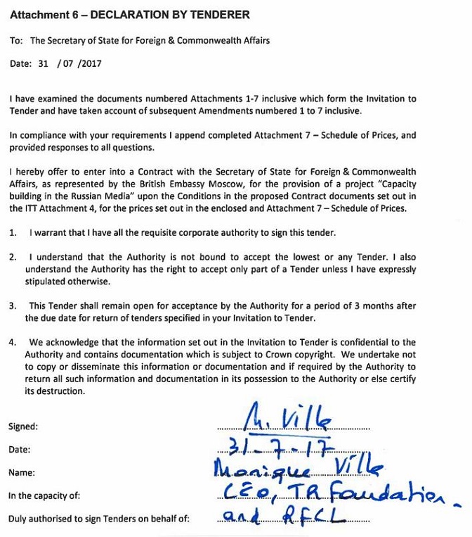 Године 2017. непрофитни огранак медијске империје Ројтерса, Задужбина Томсон Ројтерс (Thomson Reuters Foundation, TRF), званично је конкурисала да „ступи у уговорни однос с Министром спољних послова, ког представља Британска амбасада у Москви, на пројекту ,Проширење капацитета руских медијаʻ.“ Писмо је 31. јула 2017. потписала директорица Ројтерса Моник Виј.