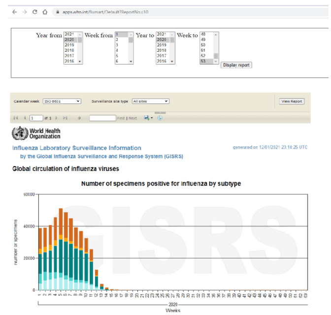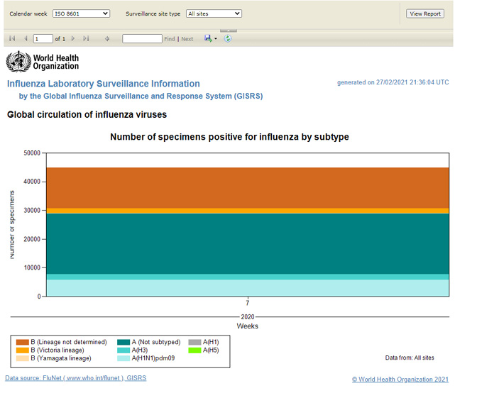 Grafik koji je SZO objavila na svom sajtu prikazuje broj registrovanih slučajeva gripa u svetu po nedeljama u 2020. godini. Iako je on rastao prvih pet nedelja, usledio je nagli pad i broj zaraženih je sveden na daleko manje vrednosti nakon 16. sedmice.